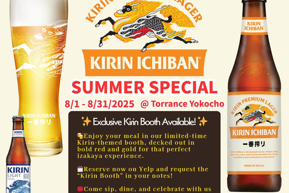 Summer Special by Kirin IchibanJuly 28, 2025September 12, 2025News 🍺 KIRIN SUMMER SPECIAL at Torrance Yokocho! 🎉August 1–31, 2025Cool down this summer with a cold Kirin in hand—at a special price you don’t want to miss!🌟 Dine in our exclusive Kirin BoothStep into a vibrant red & gold Kirin-themed booth and experience the ultimate izakaya vibes.📲 Reserve on Yelp — just mention “Kirin Booth” in your notes!✨ Limited time. Limited seats. Unlimited flavor.Let’s raise a glass, eat well, and celebrate Japanese summer the right way!🥂 While supplies last. Dine-in only. Must be 21+ to drink. Other News Tags:kirin beerspecial event augustsummer time deal