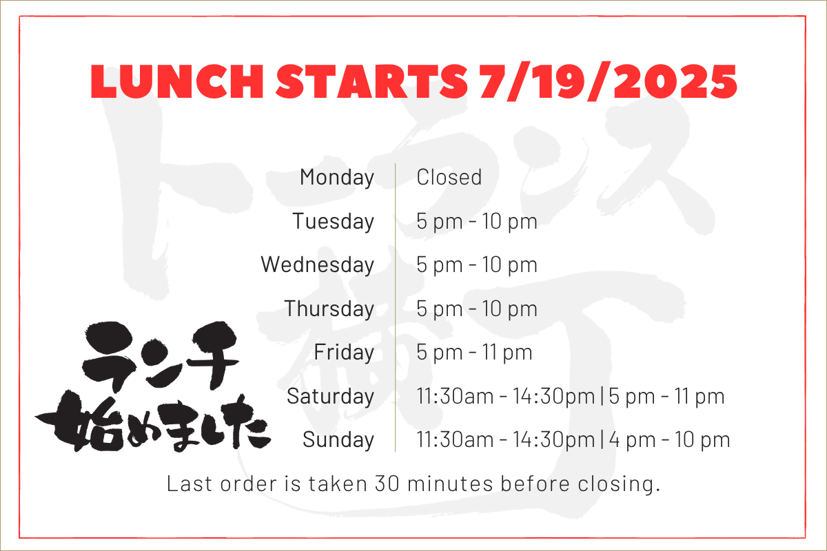 New Business Hours at Torrance Yokocho!Starting June 2025: Monday Closed Tuesday 5pm – 10pm (Last Order … 続きを読む »New Business …